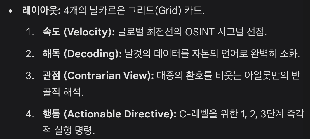 파편화된 기사, 번역에 불과한 트렌드 리포트는 밸류에이션을 방어하지 못합니다. 거시 경제(Macro)의 파도와 빅테크의 음흉한 속내(Micro)를 강제로 교차시켜, 내일 당장 C-레벨이 내려야 할 '행동 지침'만을 하달합니다.